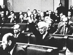 „Gdy nastąpiło głosowanie, przy pytaniu «kto jest za» Stomma jako jedyny nie podniósł ręki, dyskretnie rozglądał się po sali, do końca myśląc, że nie będzie sam. Gdy marszałek Stanisław Gucwa zapytał, kto wstrzymał się od głosu, samotnie podniósł rękę i trzymał ją dłuższy moment wysoko w górze”. I właśnie ten moment uchwyciło zdjęcie.